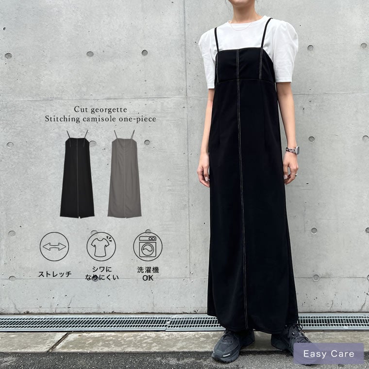 商品名: [低身長サイズ有][イージーケア]カットジョーゼット配色ステッチキャミワンピース