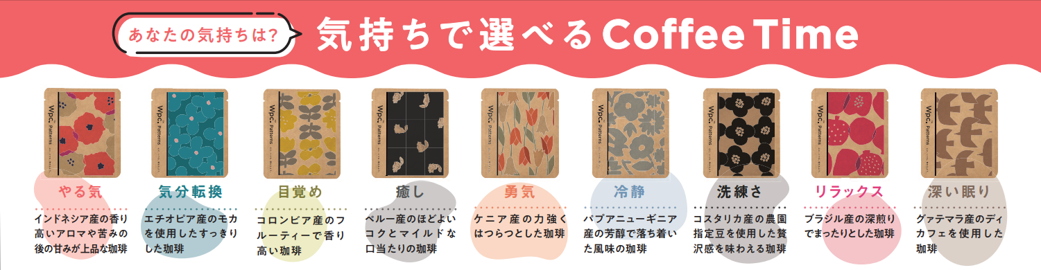今回のコラボでは、みさご珈琲のドリップバッグのパッケージに「Wpc. Patterns」の9種のデザインを施し、デザインのイメージに合わせたコーヒーをご用意しました。それぞれのドリップバッグには、デザインやフレーバーの特徴からキーワードが設定されており、手に取る人がその時の‘‘気持ち’に合わせて商品を選ぶこともできます。