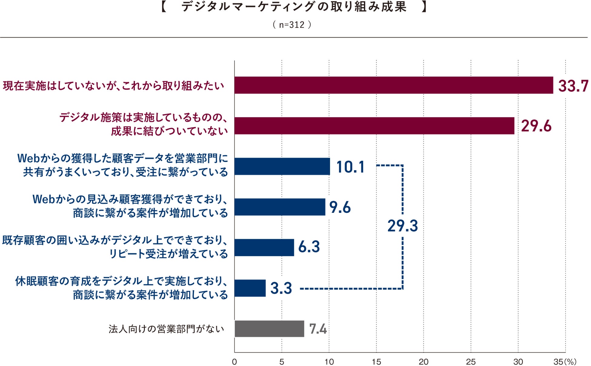 デジタルマーケティングの取り組み成果は、「現在実施はしていないが、これから取り組みたい」が33.7%と最も回答率が高く、未だにマーケティングのデジタル化に着手できていない企業が多くある現状がうかがえます。次いで、「デジタル施策は実施しているものの、成果に結びついていない」と回答した企業が29.6%となりました。一方で、施策によって何かしらの成果に繋がっている回答を合計すると約30%となることから、取り組んだ結果、成果創出ができている企業とできていない企業が二分されていることが分かります。顧客データの利活用レベルが、デジタルマーケティングの成否につながっていることが推察できます。