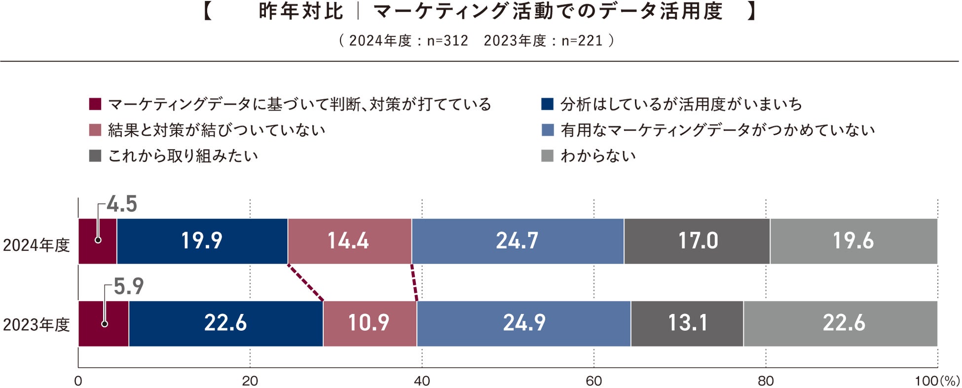 マーケティング活動でのデータ活用度について、「結果と対策が結びついていない」が14.4%となり、昨年から3.5ポイント増加していることから、データに基づくマーケティング活動ができていない企業が多いことがうかがえます。
