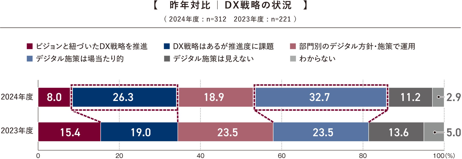 DX戦略の状況について、「デジタル施策は場当たり的」と回答した企業が32.7%、次いで「DX戦略はあるが推進度に課題」と回答した企業が26.3%となり、前年と比較しても増加傾向となりました。
