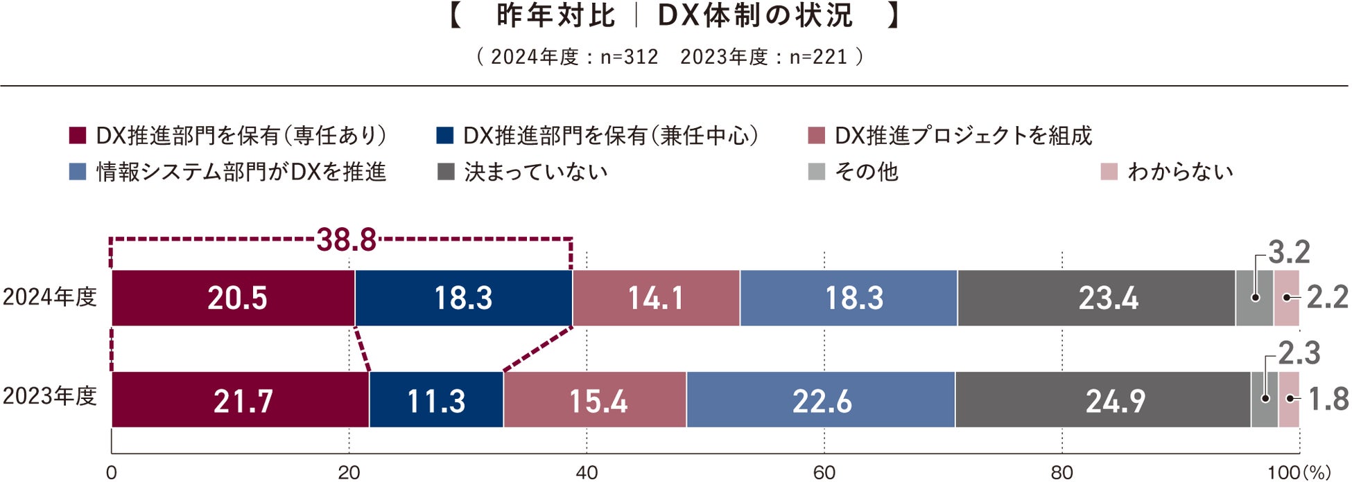 約4割がDX進捗度は「全体的に不十分」と回答、昨年から6.9ポイント増加。「推進部門を保有」は約4割も兼任中心が増加、専門人材の不足が深刻化。「2024年度 デジタル経営に関するアンケート」結果を発表