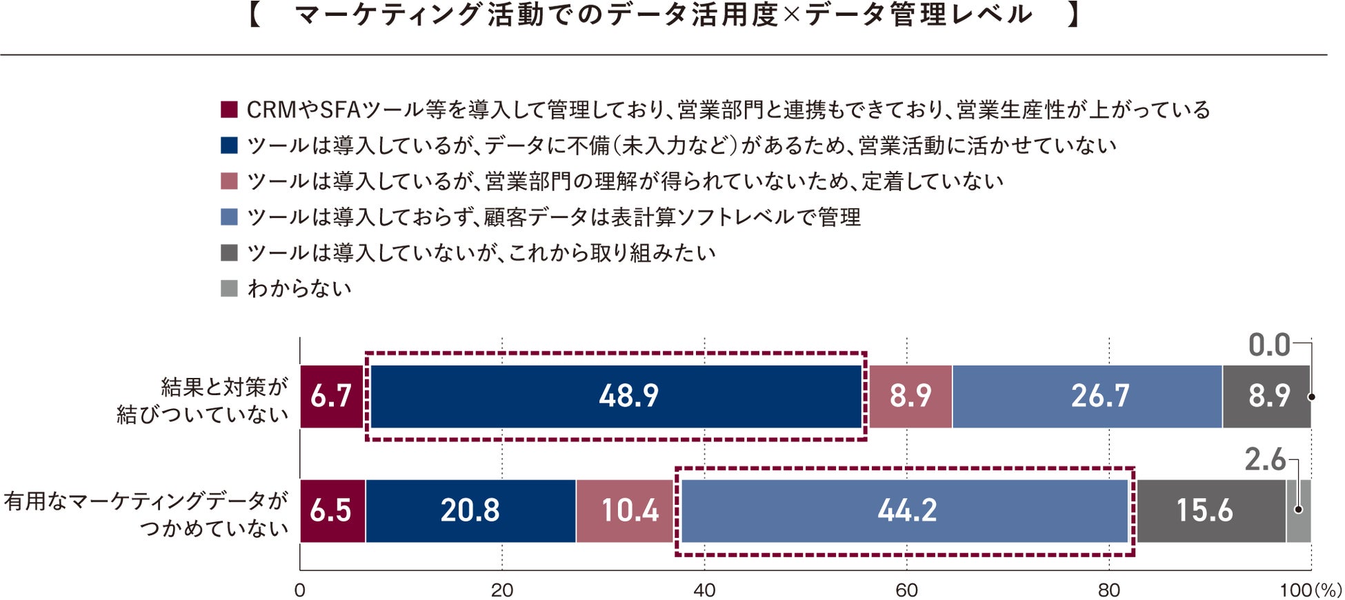 また、「有用なマーケティングデータがつかめていない」と回答した企業のうち、データ管理レベルは「顧客データは表計算ソフトレベルで管理」と回答した企業が44.2%と最も多くなっていることから、システム導入以前に手作業での集計に依存している実態も浮き彫りとなりました。