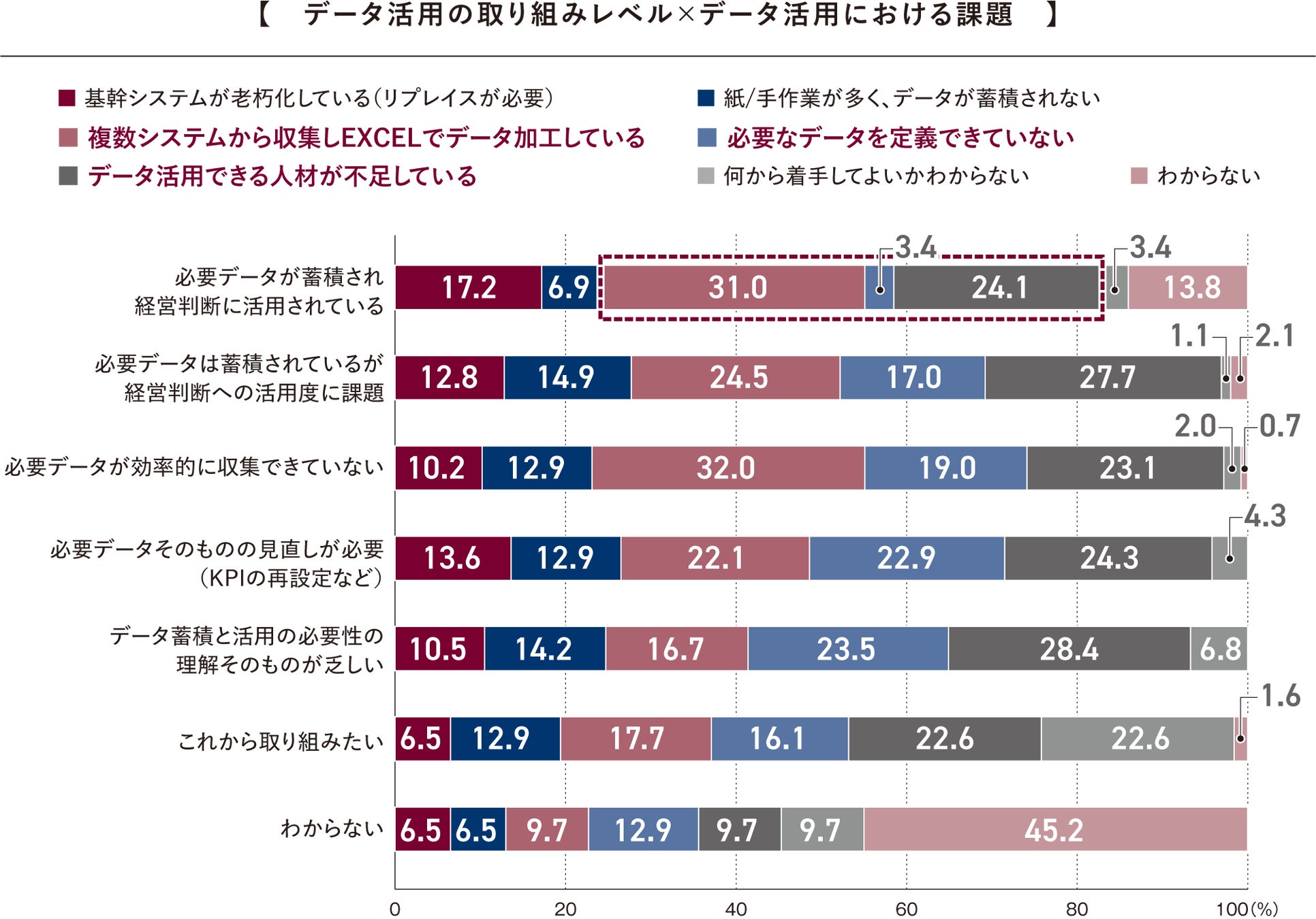 デジタル技術を活用したデータ活用の取り組みについて、「必要なデータが蓄積され経営判断に活用されている」と回答した企業のうち、「必要なデータを定義できていない」割合が3.4%と最も低くなっています。一方で、31.0%は「Excelでデータ加工している」状態です。この結果から、多少の非効率はあったとしても、自社にとって必要なデータが何かを定義できていることが、データを経営判断に活かすための重要な要素であると考えられます。