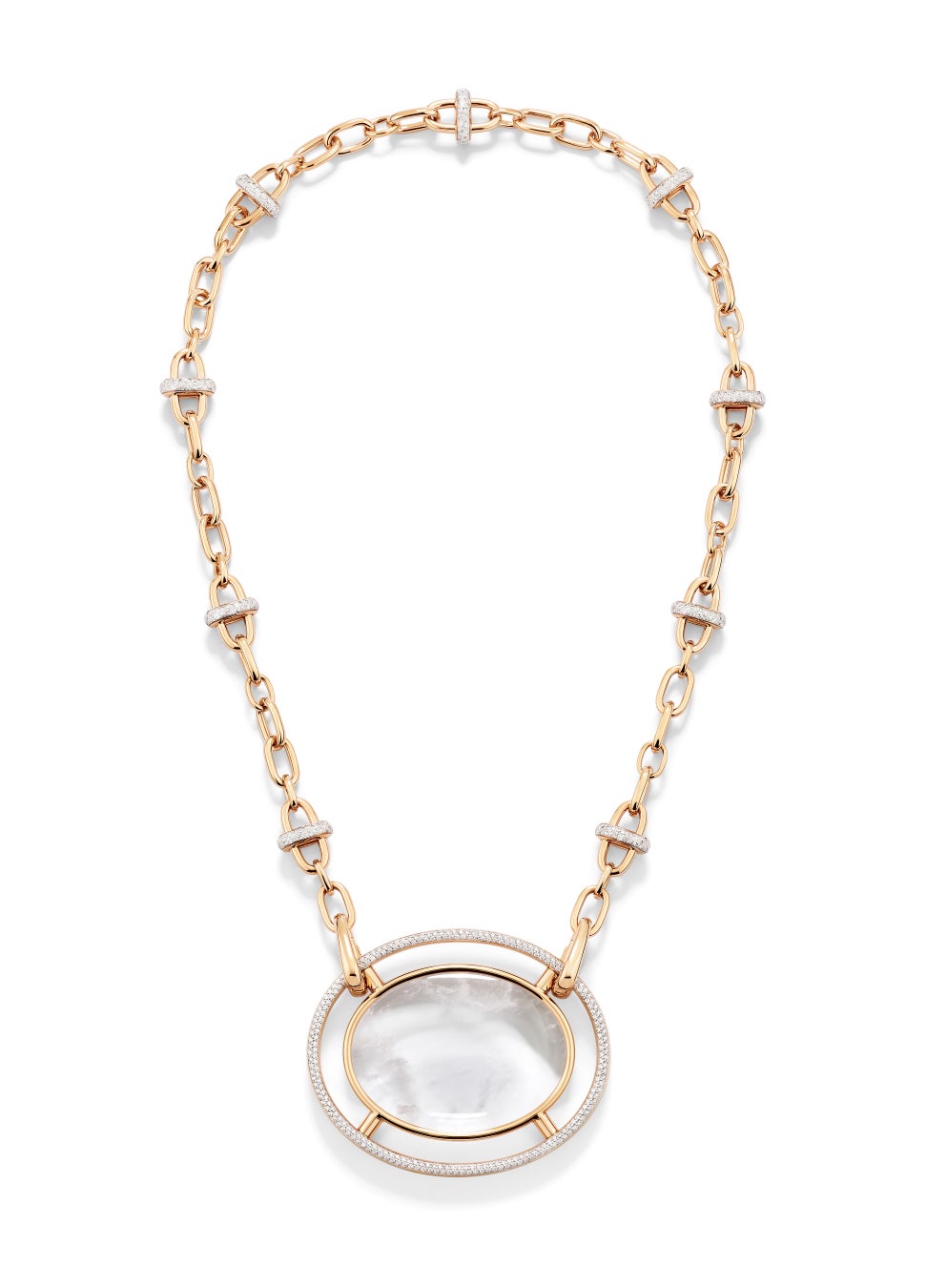 この活動を記念して、ポメラートは「The Bernini Loupe」ハイジュエリーネックレスを制作しました。これは、イタリアンアートとクラフツマンシップへ捧ぐメゾンの愛を表した、世界にひとつの傑作です。ネックレスのローズゴールドペンダントには、ロッククリスタルがあしらわれ、わずかに曇りヴェールに包まれるように魅惑的な雰囲気をまといます。それは、秋にベネチアをしばしば覆う霧を想起させ、そのドーム型の形状は拡大鏡を思わせるカットがほどこされています。これは、美のあらゆるフォームを讃える象徴となるデザインです。 ベルニーニ作品の輝きを思わせる光の戯れを生み出すように、ストーンはダイヤモンドに囲まれています。