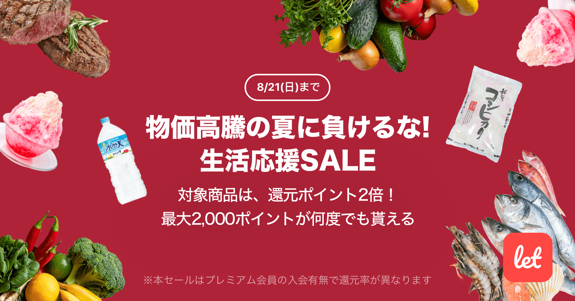 株式会社レット(本社:東京都港区、代表:佐藤 航陽)が運営する、食品ロス/在庫ロス削減のマーケット「Let(レット)」内で「物価高騰の夏に負けるな!生活応援SALE」を8月19日(金) 18:00より開催します。期間中、プレミアム会員様限定で対象の食品をご購入いただくと、2,000ポイントを上限に還元ポイントが2倍になります。期間中のご購入であれば、ポイント還元はお一人様あたり何度でもご利用いただけます。