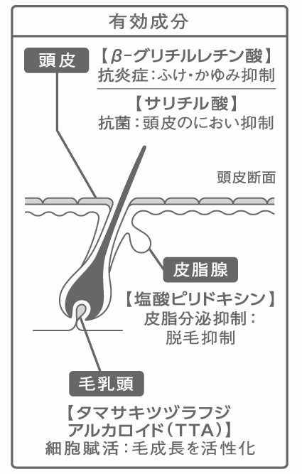 ①β-グリチルレチン酸配合 抗炎症:ふけ・かゆみを抑制します。