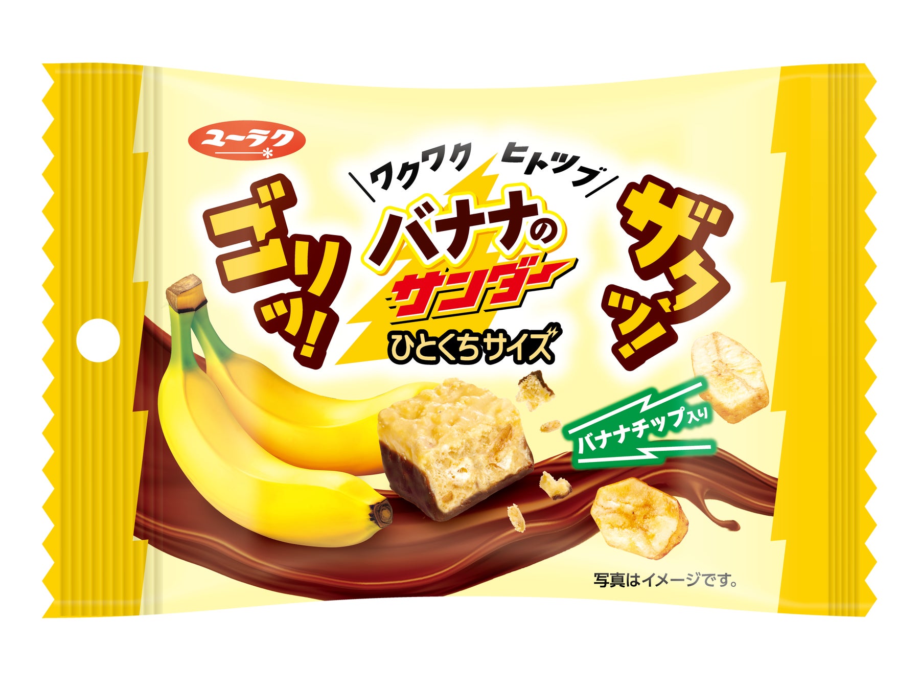 2023年5月に期間限定で発売され“バナナ×チョコ“の王道の味わいとバナナチップのクセになるゴリッと食感で人気を博した「バナナのサンダー」がひとくちサイズになって登場です。