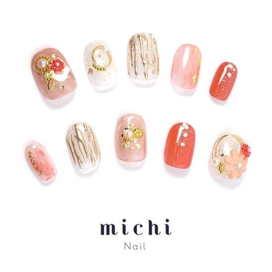 コーラルピンクとホワイトをベースにワイヤーやパール、ゴールドのパーツをふんだんに使用した和柄ネイル。寒い日に気分を上げてくれる暖かい色合いが魅力です。ゴージャスだけど、優しい色合いのベースカラーなので、成人式や結婚式などでも活躍すること間違いなしです。