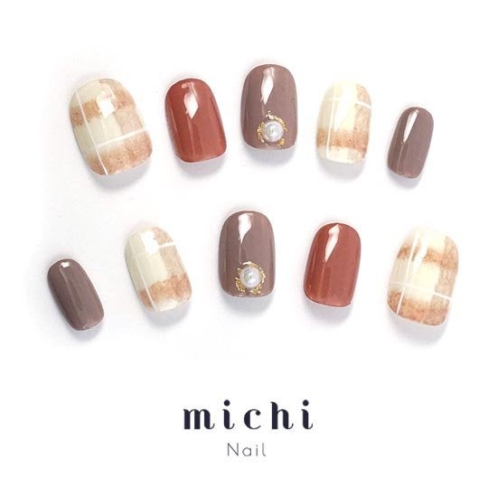 ニットのお洋服と合わせたいこちらのネイル。ブランケットのようなチャック柄のネイルがポイントです。ブランケットとテラコッタカラーを合わせることで温かみが感じられ、寒い冬に心も温まるデザインです。オフィスカジュアルとも合わせやすい色合いなので、会社でも忘年会などのイベントでもご利用いただけます!