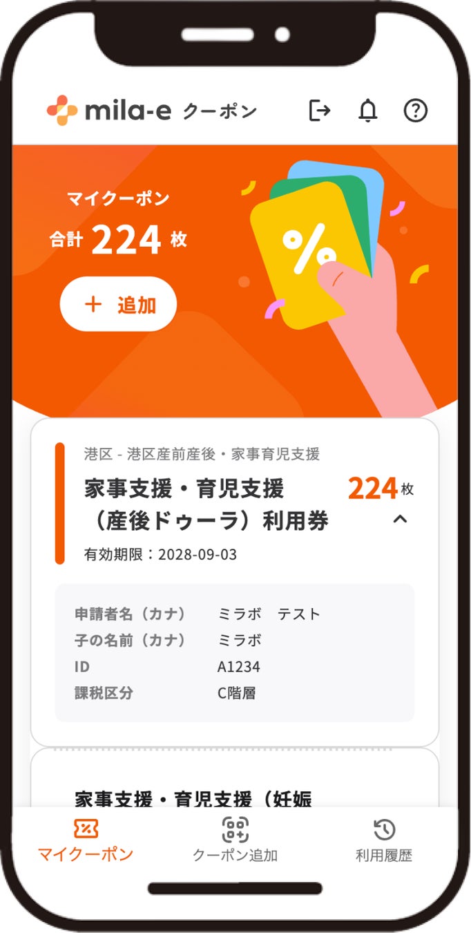 mila-e クーポンは、デジタルクーポンサービスです。産後ケアなどの デジタルクーポン・回数券を発行し、 利用状況をリアルタイムで確認できます。