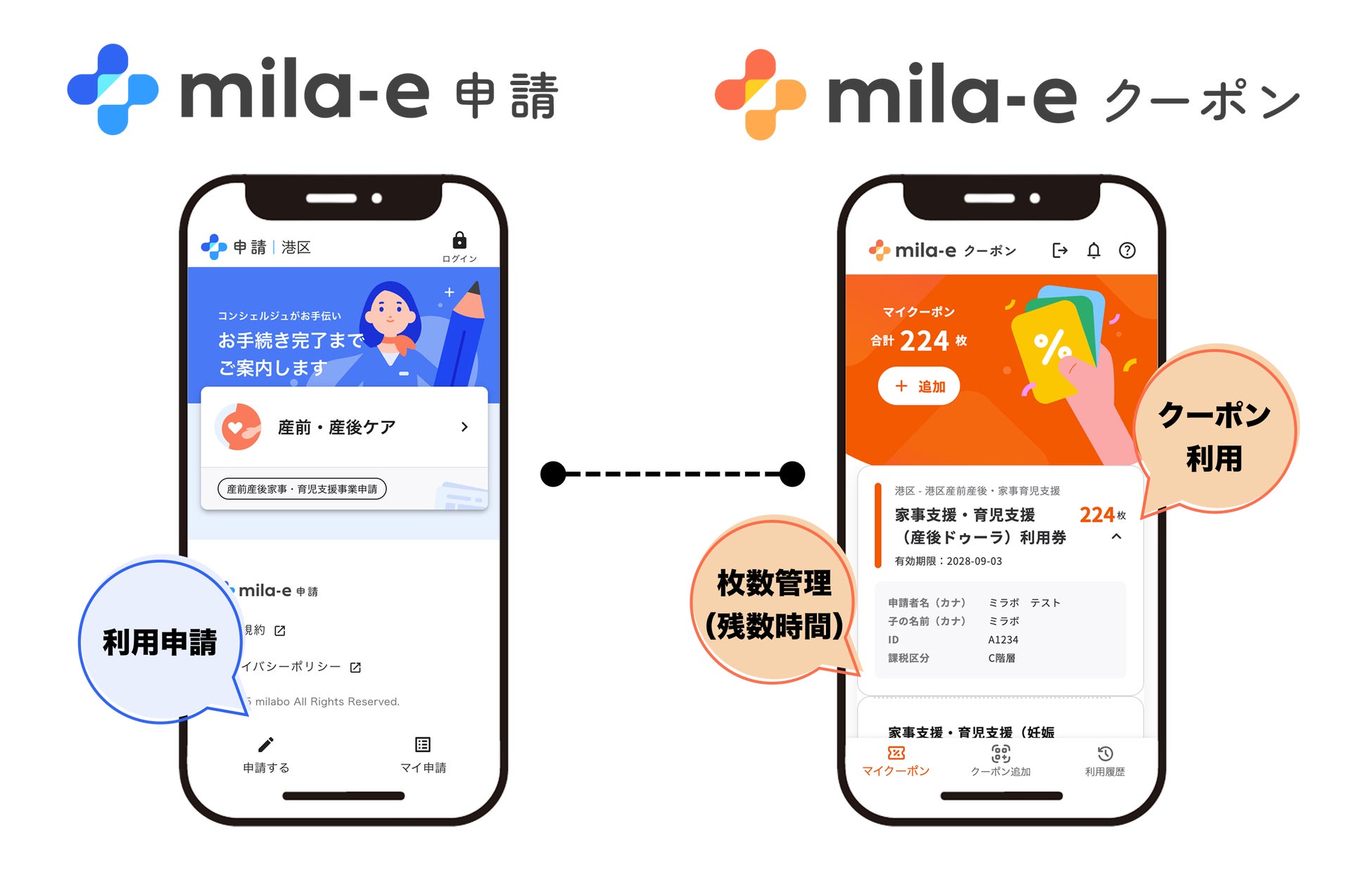 【全国初!* 】ミラボ、東京都 港区で「mila-e クーポン」「mila-e 申請」を活用した 産前産後家事・育児支援サービスにおけるデジタルクーポンの運用を開始