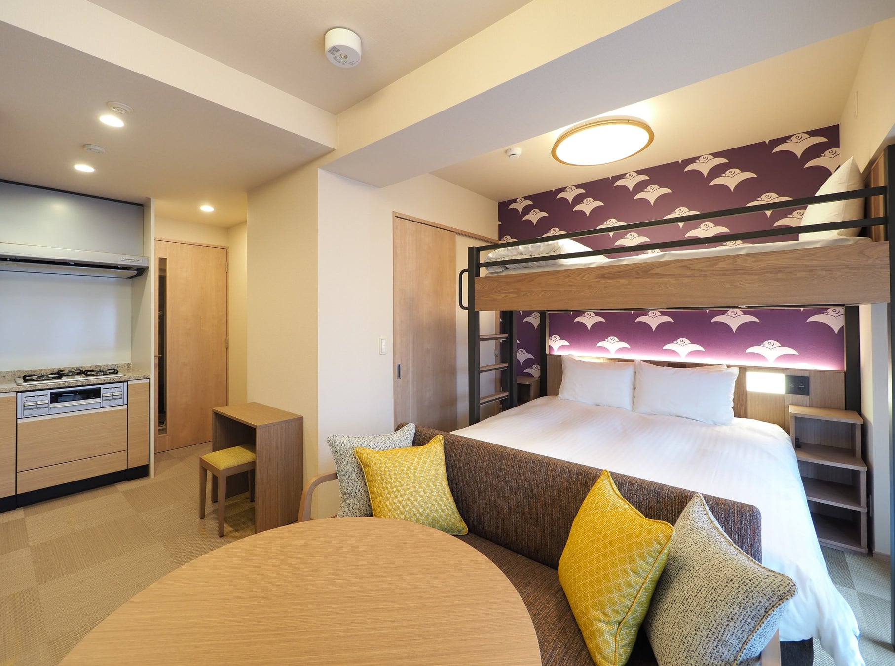 全38室からなる客室は、ツイン&ロフトベッドファミリールームをはじめ、ツインルーム、鴨川ビュー1ベッドルームスイートなど、最大7名様(添い寝のお子様含む)までご利用いただける全8種類のタイプをご用意しています。Free Wi-Fiをはじめ、キッチンや洗濯機、洗い場付きの浴室、洗面台、トイレはそれぞれ独立した水回りをすべての客室に完備しました。バスルームには浴室乾燥機も備え、長期滞在中のお洗濯ものも安心です。また、キッチンには食器類も取り揃え、調味料一式のお貸出サービス(500円)をご利用いただくことで、京都ならではの地元食材をご自身で調理しお召し上がりいただくことも可能です。