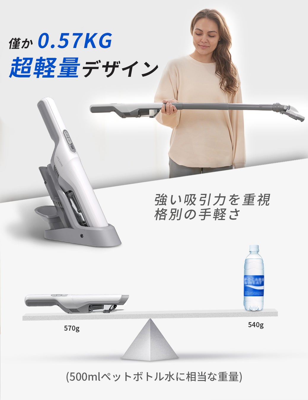 【軽くて強い】本体は僅か0.57KGです。超軽量コードレス掃除機を出品いたしました。強い吸引力を重視しながら、格別の手軽さを実現して、500mlペットボトル水に相当な重量です。*Proscenic社調査により(2022年1月現在)