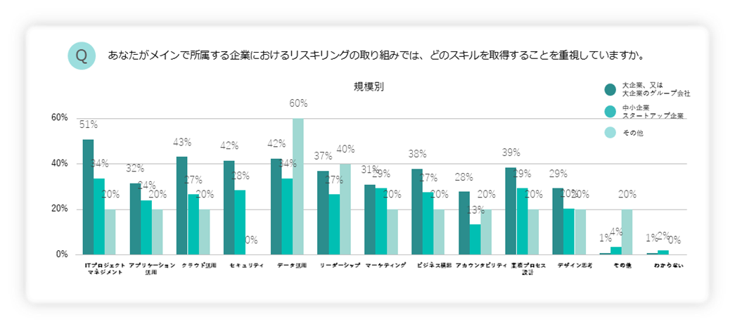 リスキリング実施者の企業において「リスキリングの取り組みでは、どのスキルを取得することを重視していますか?」と尋ねたところ、1位が 「ITプロジェクトマネジメント(42.3%)」となりました。さらに2位は「データ活用(38.7%)」、3位が「クラウド活用」(35.1%)となり、DXや攻めのITスキルの習得を重視する傾向であることが分かりました。企業規模別の回答を見ると、中小/スタートアップ企業も同じく「ITプロジェクトマネジメント」や「データ活用」が34%と高く、「業務プロセス設計」や「マーケティング」も29%となり、企業成長への土台作りとなるスキルの重視が上位となりました。一方の大企業では1位が「ITプロジェクトマネジメント」(51%)と、規模感を感じさせるプロジェクト管理スキルを重視する傾向であることが読み取れます。