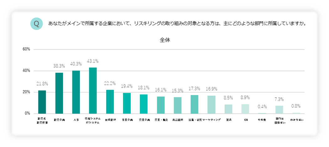 リスキリング 実施者の企業において「リスキリングの取り組みの対象となる方は、主にどのような部門に所属していますか?」と尋ねたところ、1位が「情報システム、ITシステム」(43.1%)、続いて「人事」(40.3%)、「経営企画」(38.3%)の3部門が高い結果となり、ITや人材育成領域、経営の中枢部門が高い傾向にあることが分かりました。経営企画や人事の比率が高いのは、リスキリングがトップダウン(経営主導)で行われていることから、企業の管理部門から実施されるためであると予想できます。また、情報システム・ITシステムの比率が高いのは、ITプロジェクトマネジメントやデータ活用等の領域が高いことに関連があると予想できます。