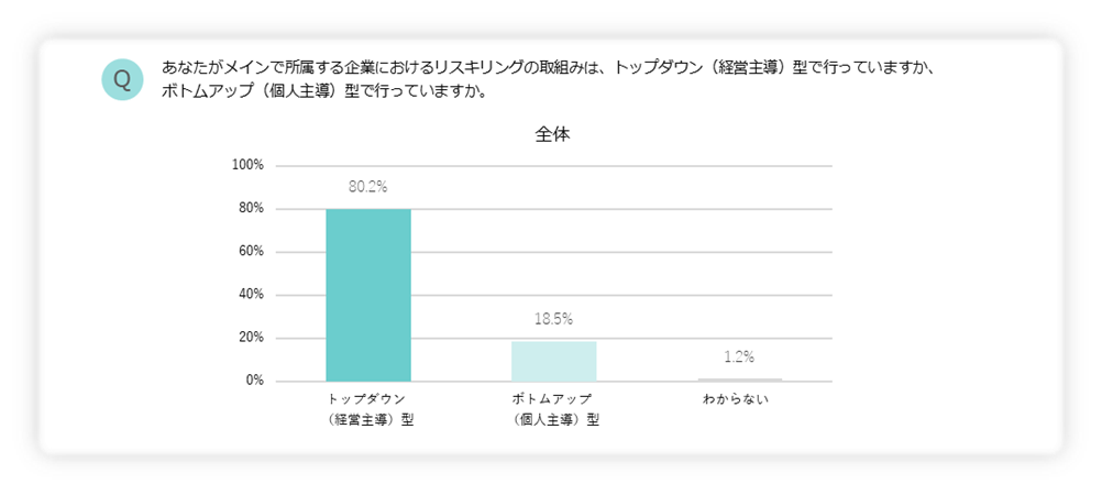 リスキリング実施者に対して、その所属企業における「リスキリングの取組みは、トップダウン(経営主導)型で行っていますか、ボトムアップ(個人主導)型で行っていますか?」と尋ねたところ、「トップダウン(経営主導)型」との回答が全体の80.2%と、高い割合となり、多くの企業がトップダウン型でリスキリングの取り組みを進めていることが分かりました。大企業、中小/スタートアップ企業ともに、リスキリング実施は「トップダウン型」が中心であることが分かります。
