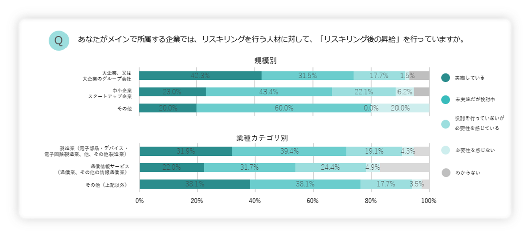 リスキリング 実施者の企業において「リスキリング後の昇給を行っていますか?」と尋ねたところ、「実施している」が33.1%と、3分の1の企業がすでにリスキリング後の昇給を実施していることが分かりました。また、「未実施だが検討中」との回答も37.5%に上り、合計で7割以上の企業が、リスキリング後の昇給について実施または前向きである傾向が分かりました。企業規模別の回答を見ると、昇給実施の傾向としては大企業が先行しているものの、中小/スタートアップ企業でも「実施または前向き」な企業が60%を超えており、リスキリング後の昇給に対して積極的に検討していることが分かりました。