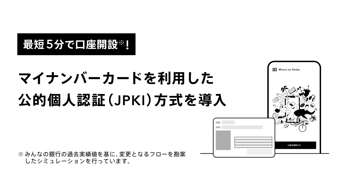 株式会社みんなの銀行(取締役頭取 永吉 健一、以下「みんなの銀行」)は、2025年7月中旬より、口座開設において、マイナンバーカードを利用した公的個人認証(JPKI*¹)方式を導入します。 JPKI方式を用いることで、高いセキュリティを確保しながら、最短5分*²で口座開設を行うことができるようになります。
