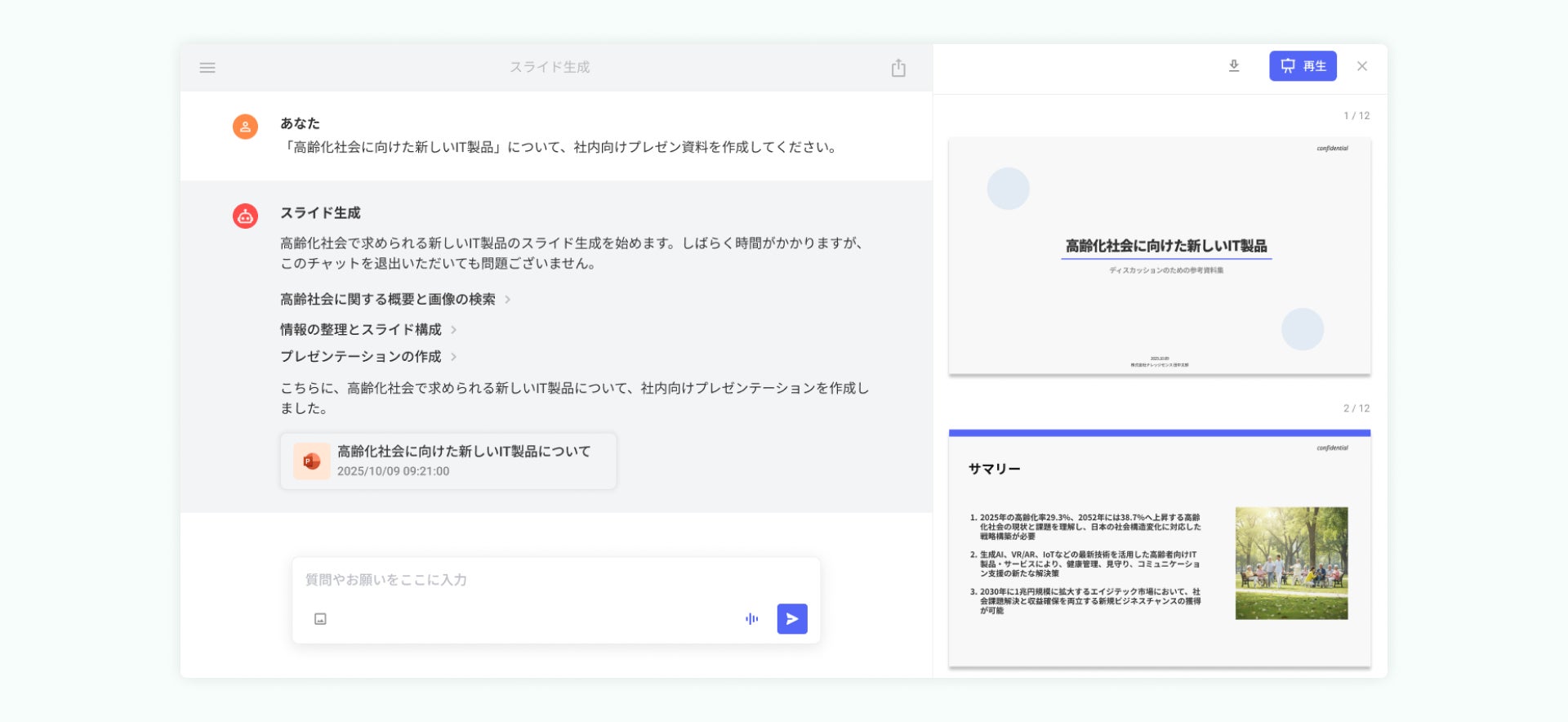 そこで、ChatSenseでは、このような課題を解決するため、セキュリティの高い環境で、日本語で指示をするだけでスライドを自動で生成してくれるスライド生成AIエージェント機能のリリースを決定いたしました。これにより、資料作成にかかる時間が大幅に短縮され、企業全体の生産性向上に貢献することが期待されます。