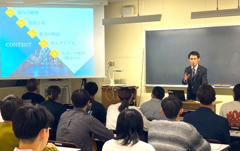 本講義は、神奈川大学を卒業し、現在鈴与株式会社とパートナーシップ契約を締結している競泳 望月絹子選手との繋がりから、同大学の要請を受けて実現。同大学に所属する学生アスリート1年生から3年生までの計33名を対象に実施しました。当日は、学生のキャリア形成を支援することを目的に、当社の事業紹介と共に学生がイメージを持ちにくいB to Bのビジネス形態や魅力について説明し、理解を深めてもらいました。