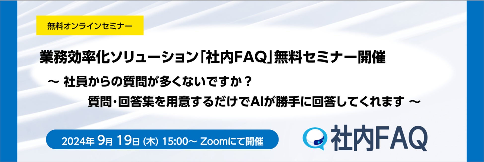 株式会社ニーズウェル(本社:東京都千代田区、代表取締役社長 船津浩三)は、2024年9月19日(木)15時より、無料オンラインセミナー「業務効率化ソリューション「社内FAQ」無料セミナー ~社員からの質問が多くないですか?質問・回答集を用意するだけでAIが勝手に回答してくれます~」を開催します。