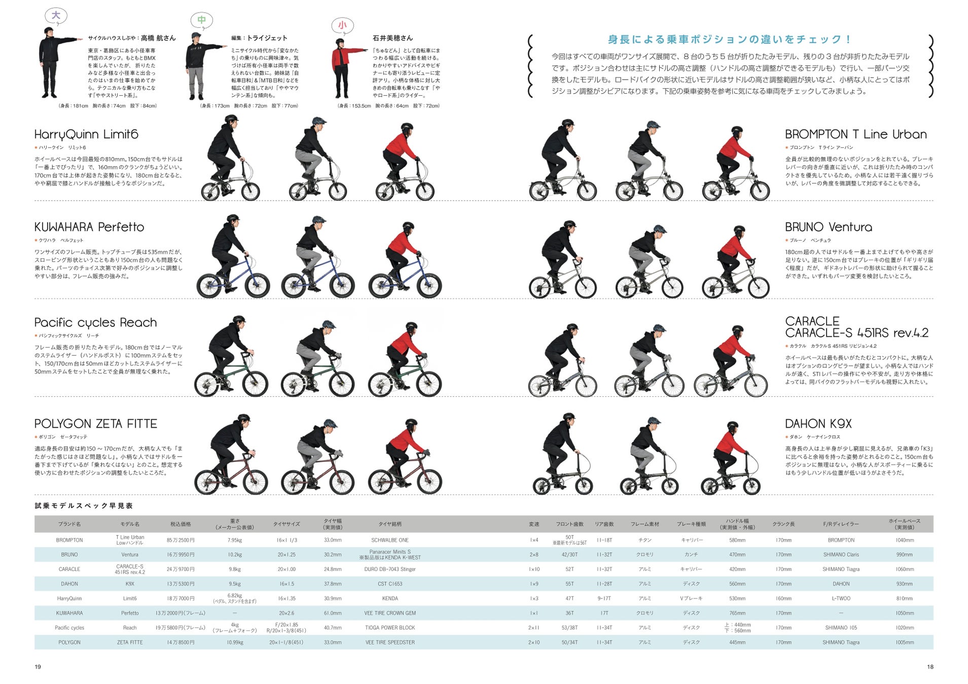 ロードバイクやMTBと違いサイズ展開の少ない小径自転車は、体格によって乗車姿勢が大きく変わり、乗った印象も異なります。そこで、異なる身長のライダーによる試乗レビューを実施。「自分が乗るイメージをしやすい」人気企画です。