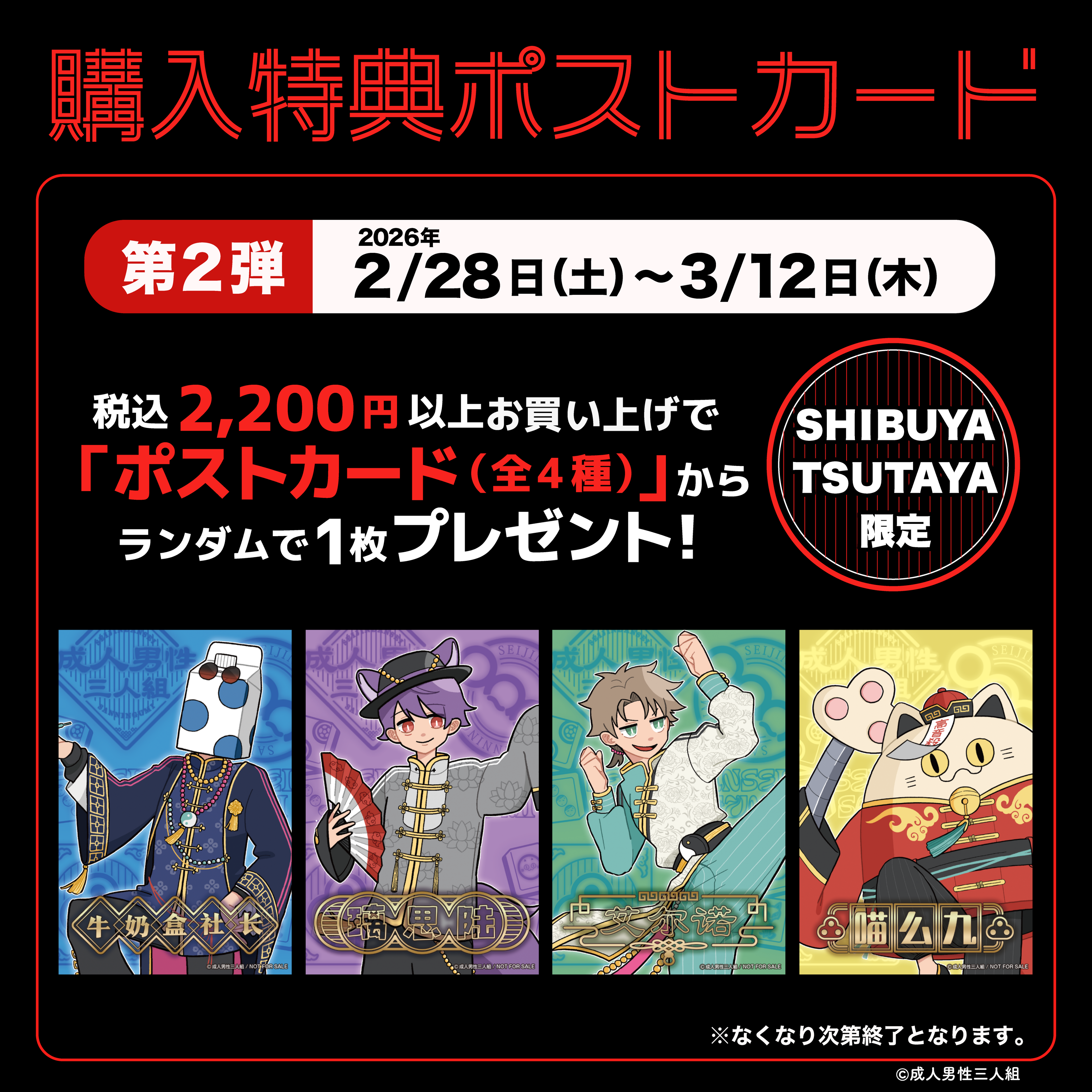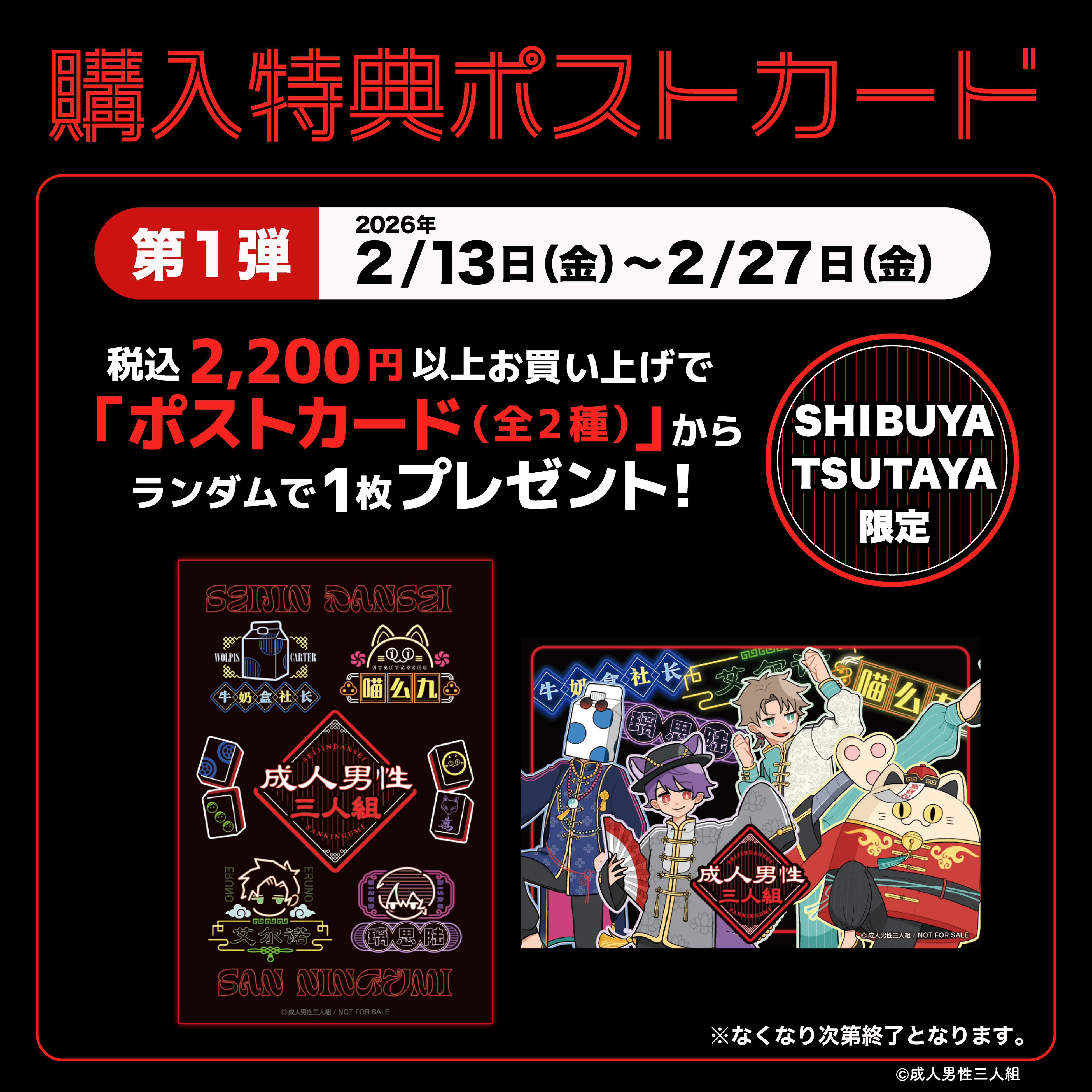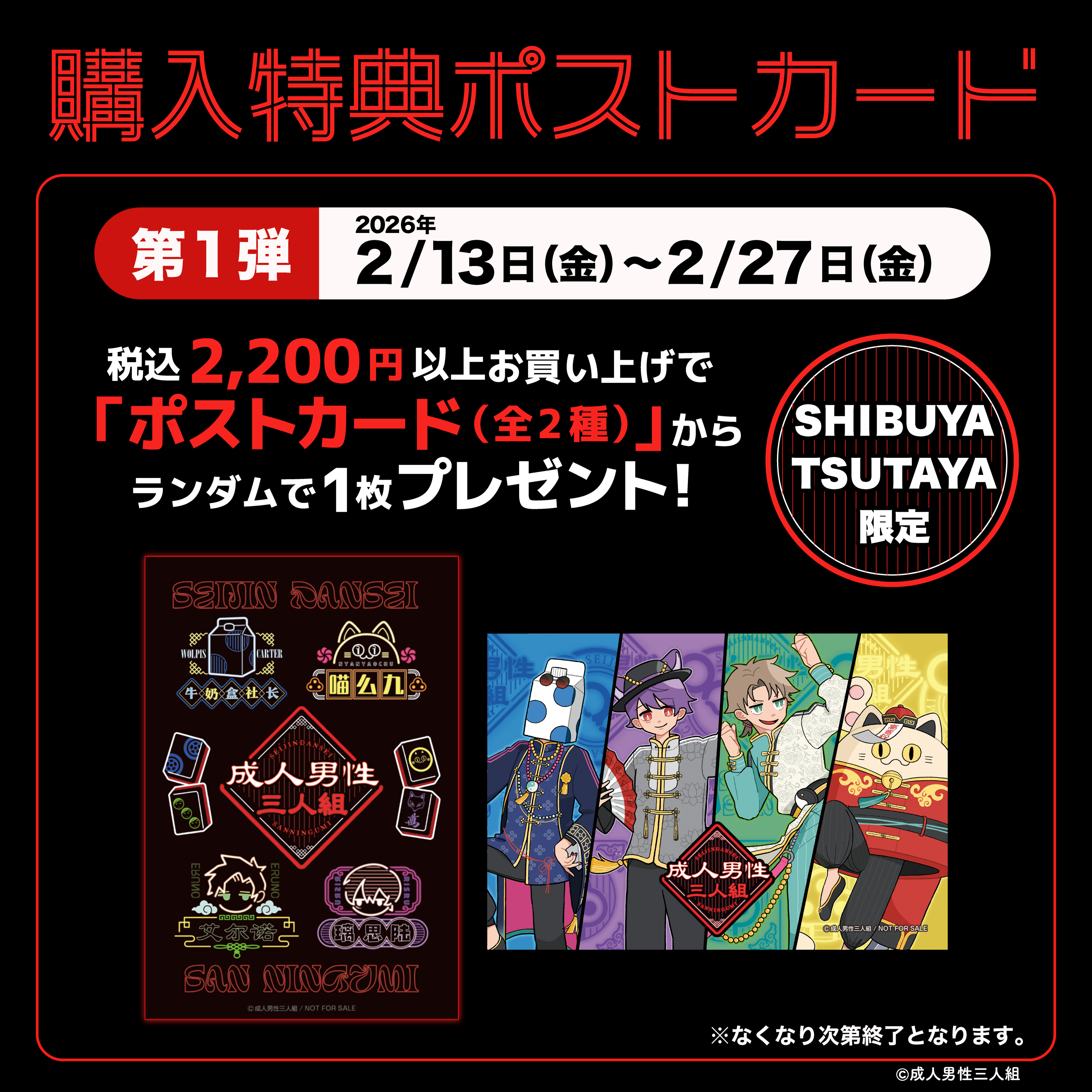 2026年2月13日(金)より、歌い手グループ『成人男性三人組』POP UP SHOPがSHIBUYA TSUTAYA 6階 IP書店で開催決定!!