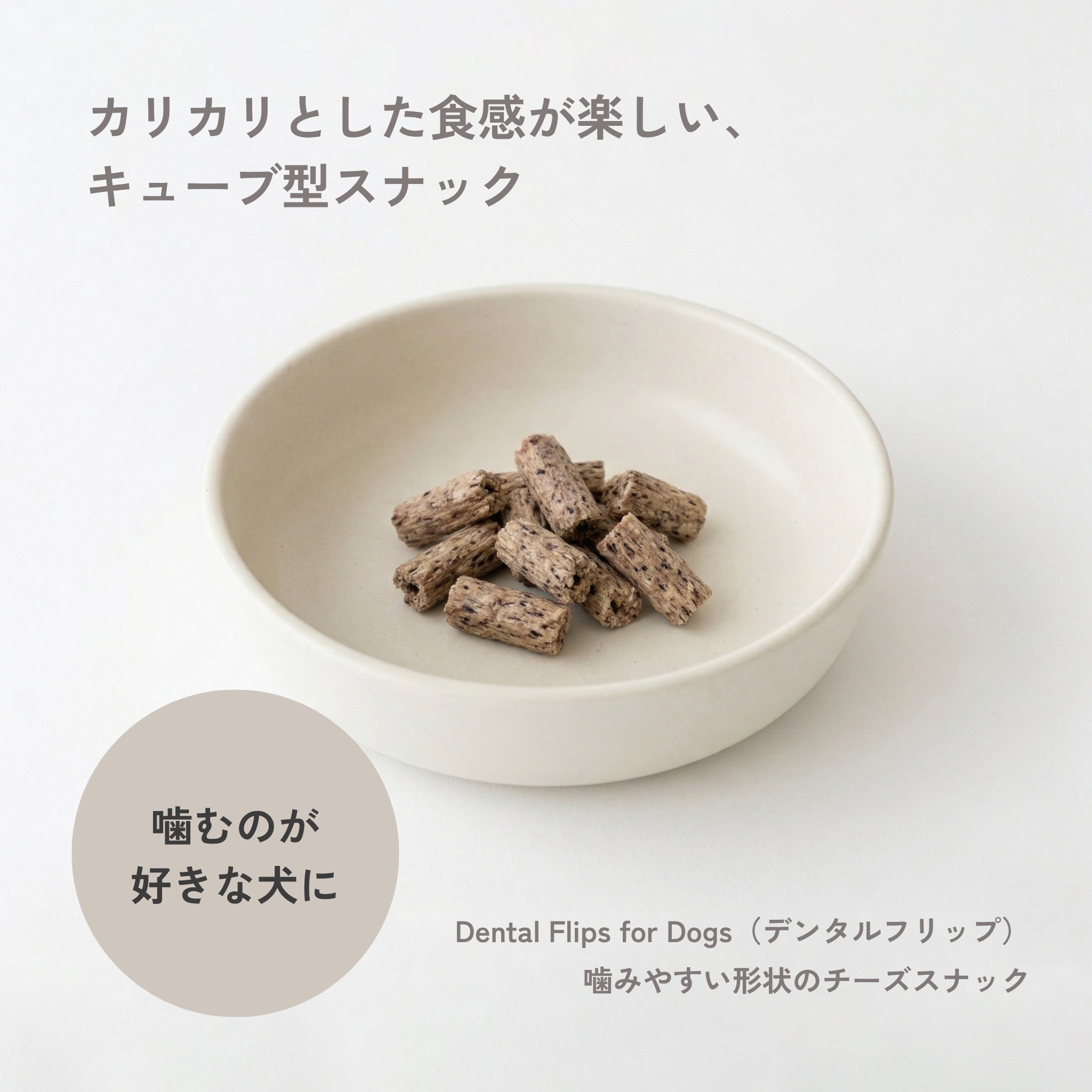 「Dental Flips for Dogs」は、噛むことが好きな小型犬にも取り入れやすいキューブ型スナックです。毎日のおやつ時間の中で自然に続けやすく、愛犬のお口の健康維持をサポートします。