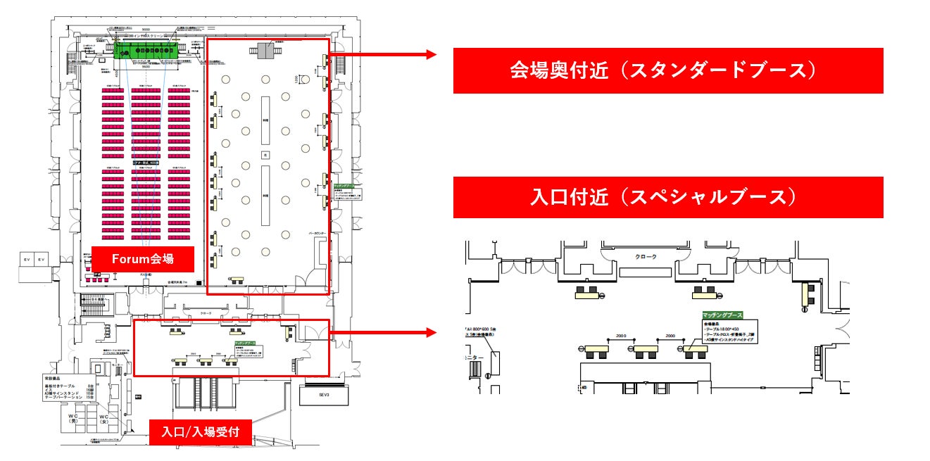 本Forumのブース出展エリアは、入口付近のスペシャルブースと会場奥付近のスタンダードブースの2か所に分かれます。