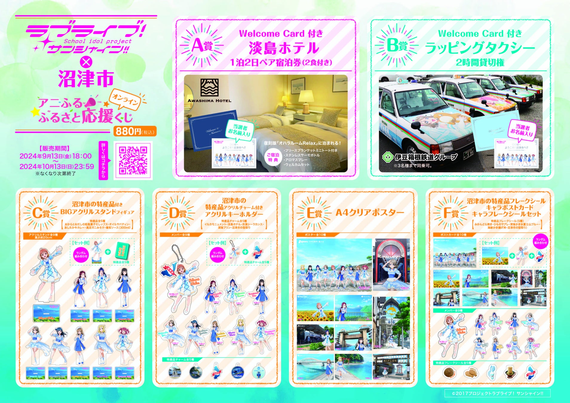 第1弾は「ラブライブ!サンシャイン!!×静岡県沼津市」をテーマに、沼津市内のホテル宿泊券やオリジナルイラストを使用したアクリルグッズ等の商品がハズレなしで当選します。