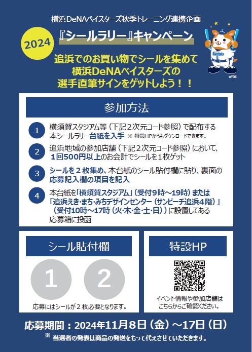 神奈川県横須賀市(市長:上地 克明)では、横浜DeNAベイスターズ(以下、同球団)の秋季トレーニングが同球団ファーム施設「DOCK OF BAYSTARS YOKOSUKA」(夏島町)を中心に今秋も実施されることに合わせ、同球団にご協力いただき、球場周辺地域の活性化を目的とした連携企画を開催しています。