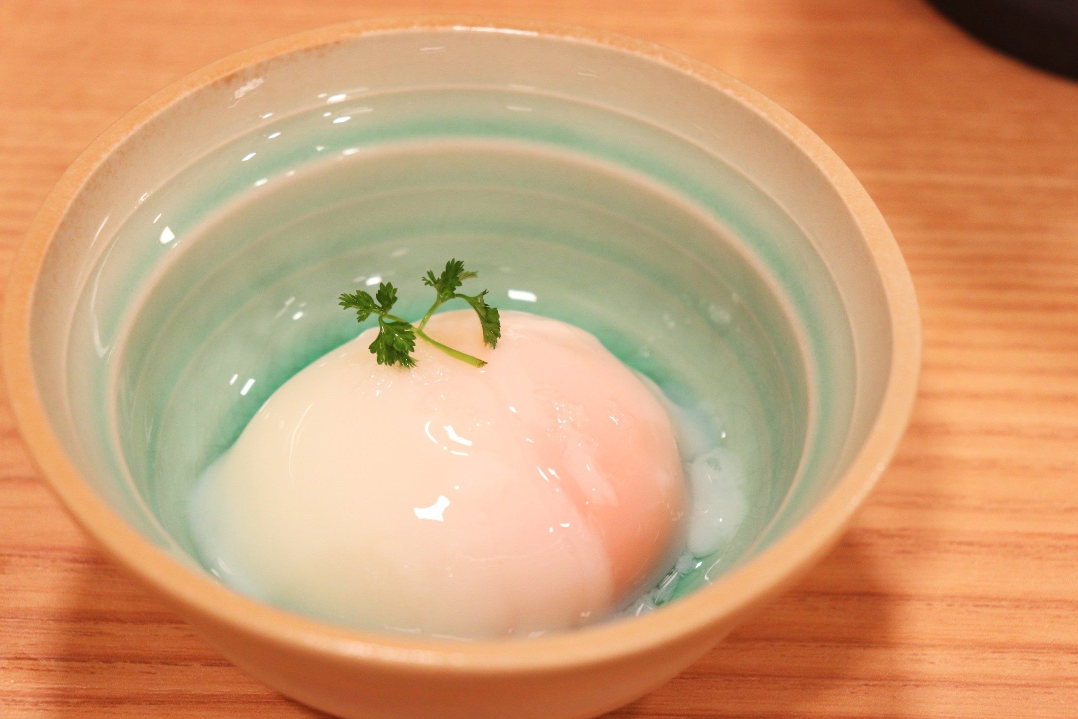 低温で丁寧に火入れした「柚子の香り 温泉卵」は、なめらかな口当たりとともに柚子の香りがふわりと広がる一品。塩で味わうことで、甘みとコクがより一層引き立ちます。