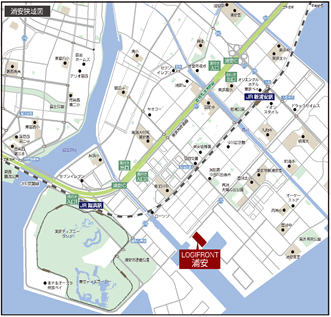 本施設は、東京都心部から15km圏内、首都高速道路湾岸線「舞浜IC」から約2.4kmに位置しており、幹線道路(首都高速湾岸線・国道357号線)による関東圏全域へのアクセスが良好なエリアとして利便性が高く、広域集配送の拠点として期待されている立地環境にあります。