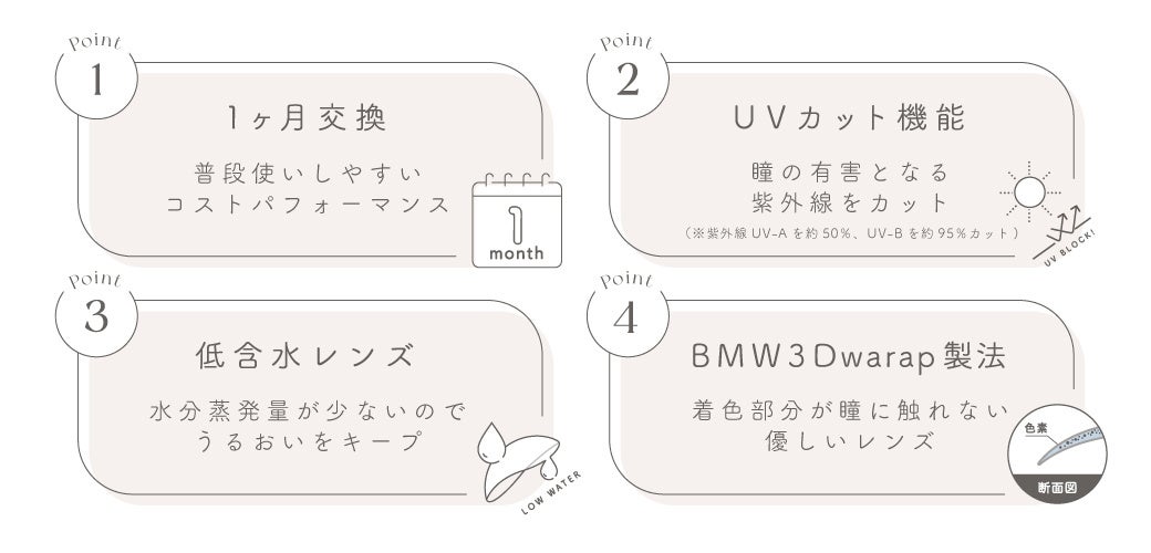 - カラコン初心者でも、安心して使用できるレンズスペック。