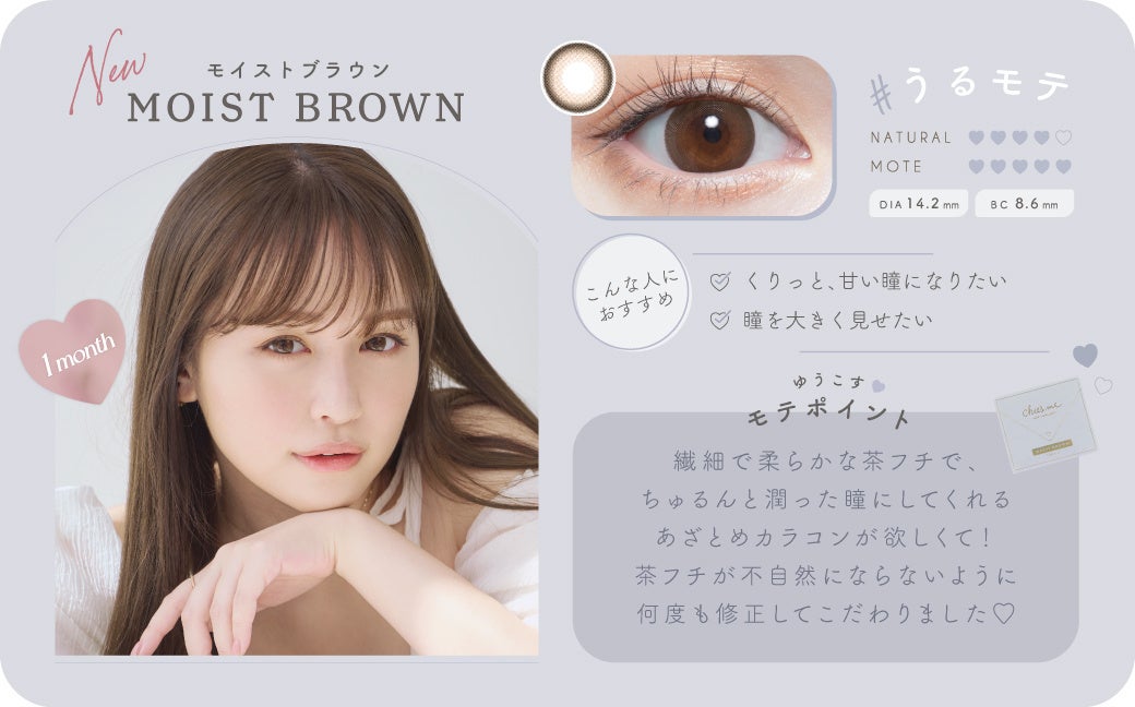 今回、マンスリーとして追加発売するのはモイストブラウンとシフォンブラウンの2色。Chu's meユーザーへのアンケートを元に、マンスリー化の要望が多かった⼈気カラーが選ばれました。