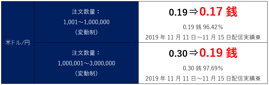 11月に入り、米ドル/円の第1区分(1~1,000注文数量)のスプレッドを2回(11月1日、11月19日)にわたり縮小して参りました。これまでも当社は“より低コスト”で“より利便性の高い”のFX取引のサービスを提供して参りましたが、更なる業界最狭水準の取引をご体感頂ける環境を提供すべく、最も投資家のニーズが高い米ドル/円の第2・第3区分(1,001~3,000,000注文数量、変動制)の下限スプレッドをキャンペーン期間中大幅に引き下げてご提供することと致しました。