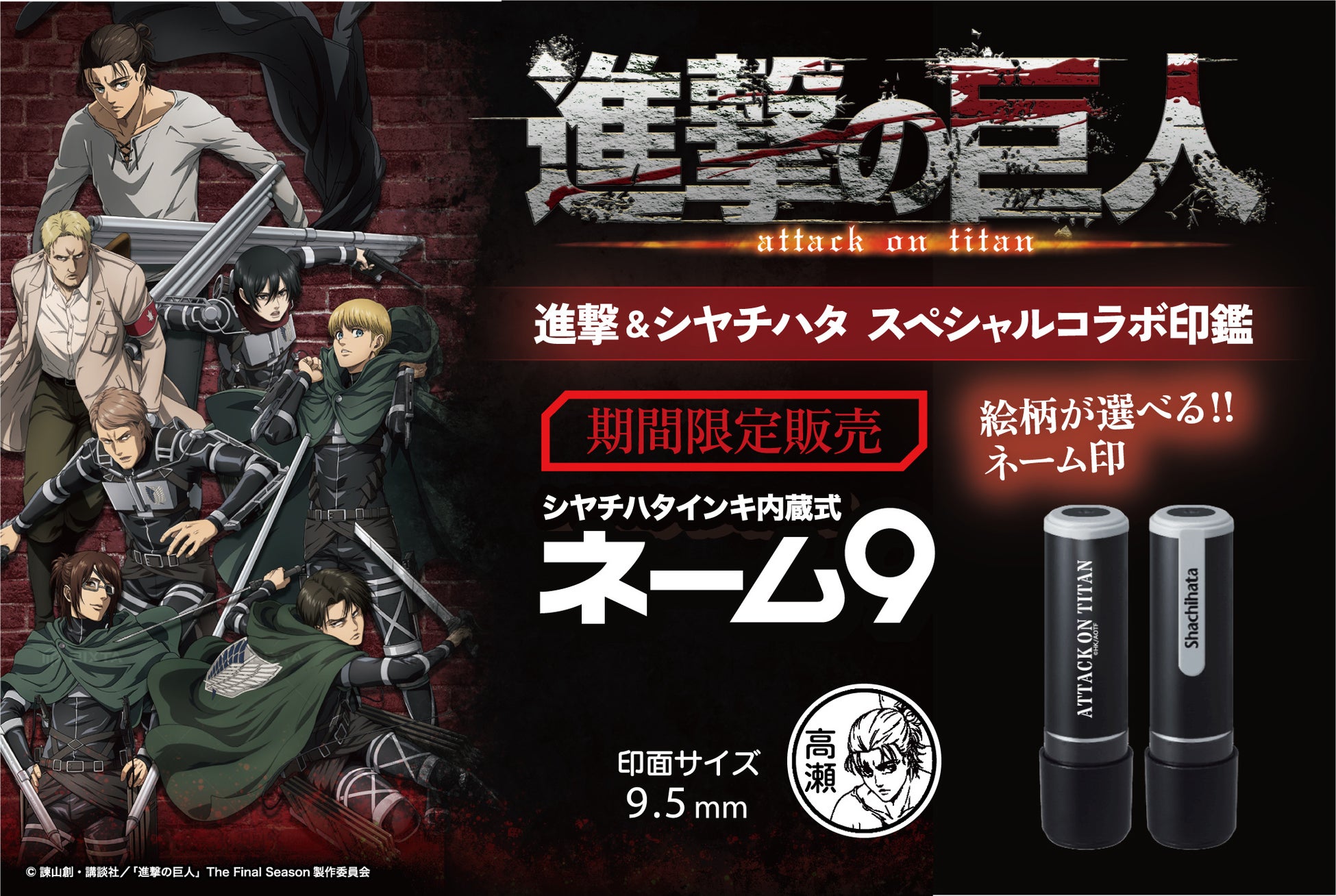 進撃の巨人×シヤチハタ コラボ ネーム9が登場 「ネーム9 進撃の巨人」発売~8月26日(金)より予約販売開始!キャラクター入りの印面が作成可能~