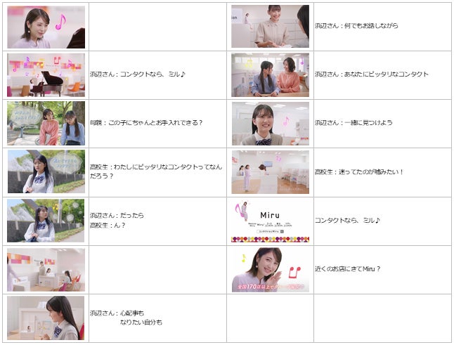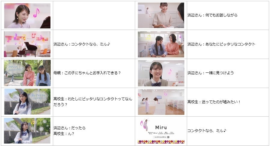 今回の「Miru『ハッピー音符』」篇では、浜辺美波さんがMiruの妖精としてお店に登場。「コンタクトならMiru♪」と軽やかに歌いながら、ピアノを演奏するシーンでCMが始まります。軽やかなメロディーと共に、ところどころに登場するハッピー音符が、Miruの妖精である浜辺さんと共にユーザーのコンタクトに対する不安を払拭していきます。「この子にちゃんとお手入れできる?」「私にピッタリなコンタクトって何だろう?」とコンタクトレンズ選びに対して悩みや不安を感じている親子や女子高校生をMiruのお店へと導き、自分に合ったコンタクトを見つける姿をそっと見守りながら、コンタクトデビューを温かく応援。ピアノに挑戦する浜辺さんの可愛らしい姿や、小さくなって初めてのコンタクト選びをやさしく見届ける演技にご注目ください。