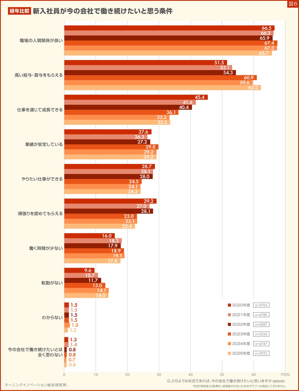 年度別に変化があった項目は、「高い給与・賞与をもらえる」と回答した割合で、2020年度は51.5%のところ、徐々に増加し2025年度は6割を超えました。一方、「仕事を通じて成長できる」と回答した割合は、2020年度は45.4%のところ、2025年度は33.5%に減少しました(図6)。