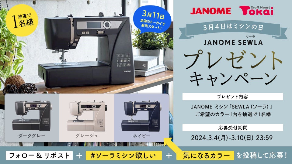 3月4日はミシンの日!JANOME『SEWLA』ミシンのお好きなカラー1台が当たる!X(旧Twitter)キャンペーン開催。全国のトーカイでは3/11から限定150台の販売スタート!