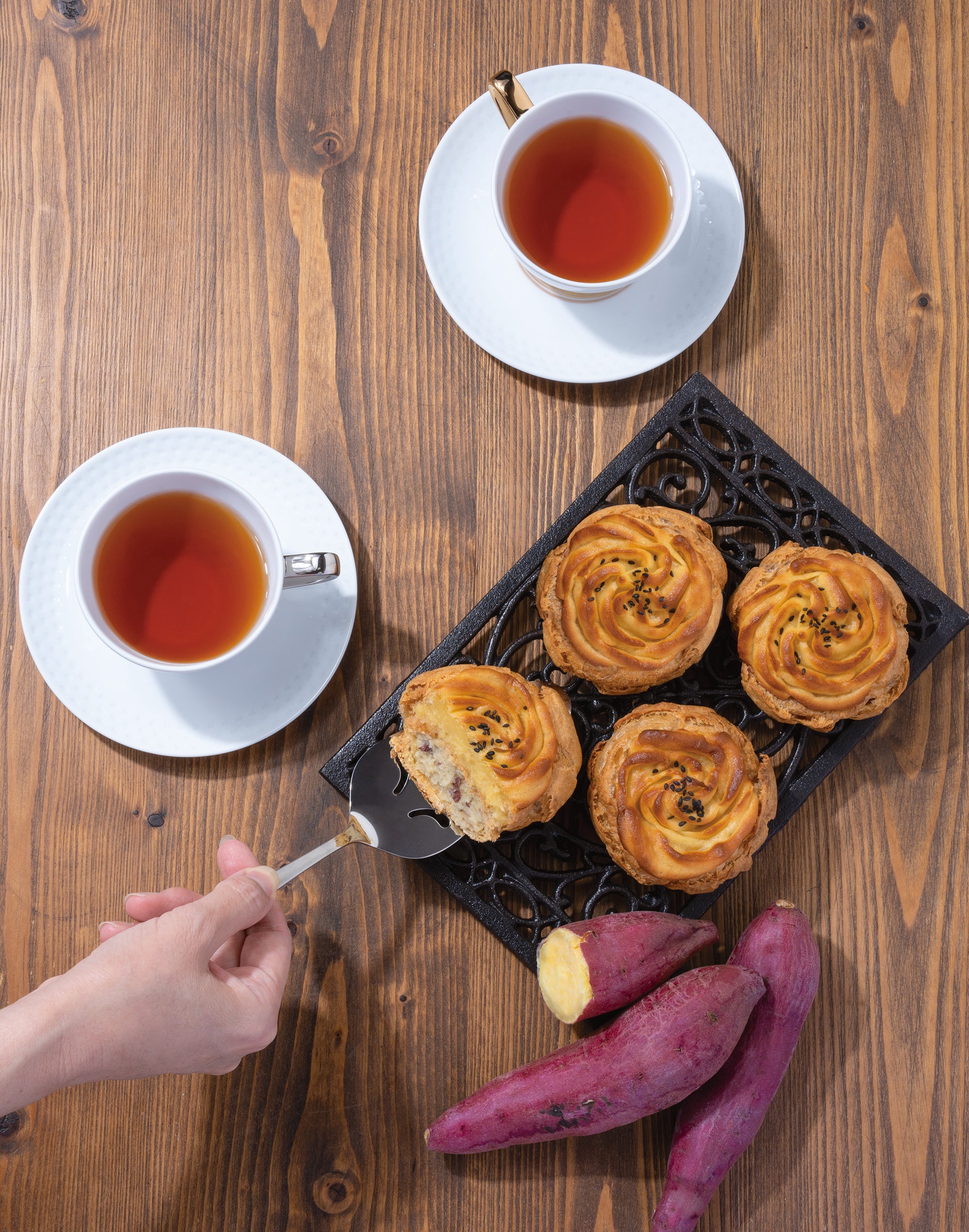 この新作スイーツはビアードパパが長年培ってきた包あん技術と焼成技術によって生まれたサクサク食感のオリジナルシュー生地をベースに、お芋らしいほくほく食感と濃厚なしっとり食感、異なるスイートポテトを2層に重ね、店内のオーブンで丁寧に二度焼きしています。“シュークリーム”と“スイートポテト”というなじみ深い2つのスイーツが、「サクサク」「ほくほく」「しっとり」3つの異なる食感を同時に味わえ、絶妙にマッチするこれまでにない新食感スイーツとして新たに誕生いたしました。