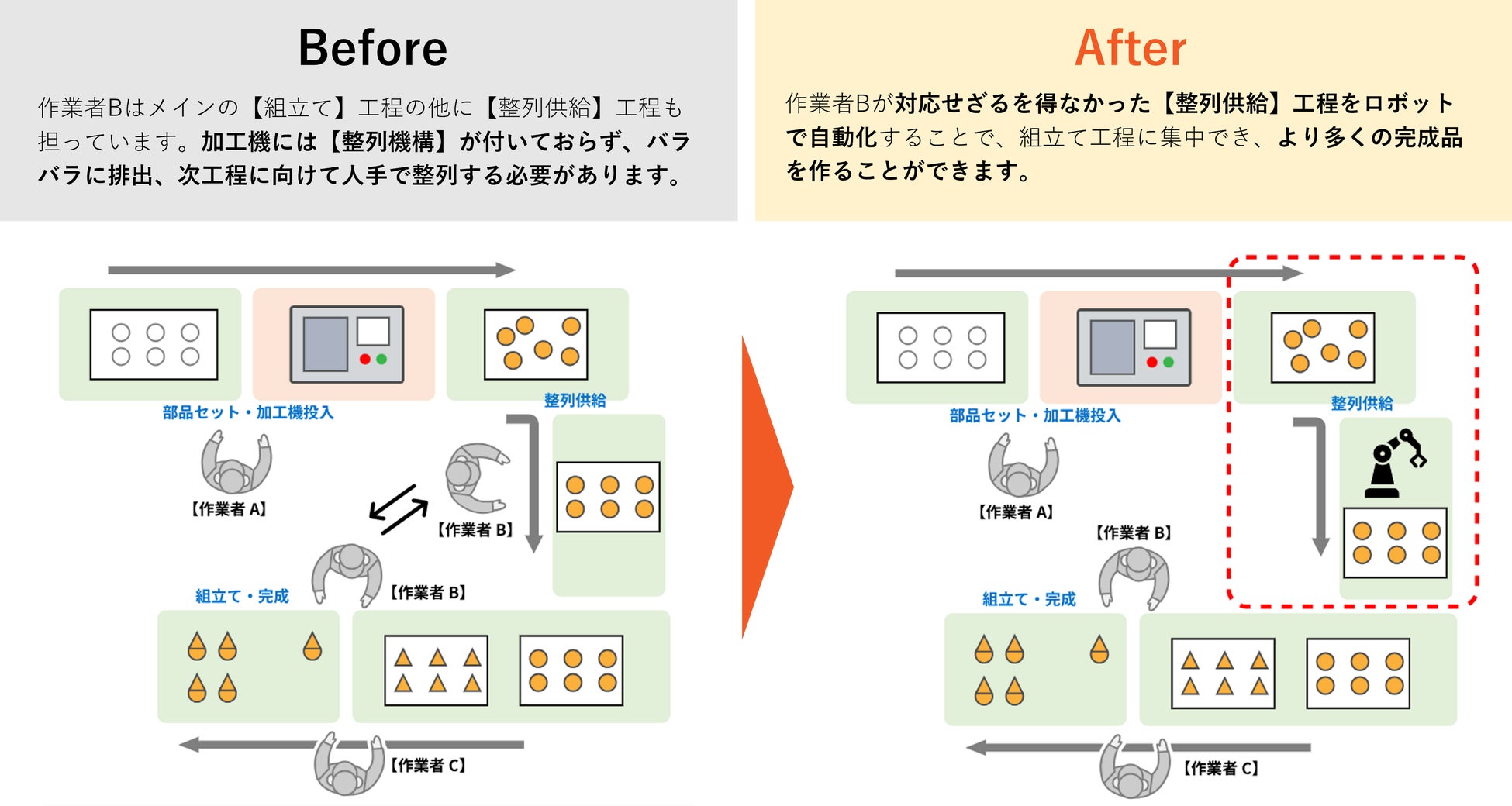 「姿勢変更」「方向揃え」「整列供給」「位置決め」「目視検査」などの、特に人手からの解放が急務とされる5つの工程を容易に自動化することで、作業者がよりコア工程に集中できます。これまで人の手で培ってきた中堅製造業の【製造技術】【固有の強み】を維持したまま、工場全体の生産能力向上を支援します。