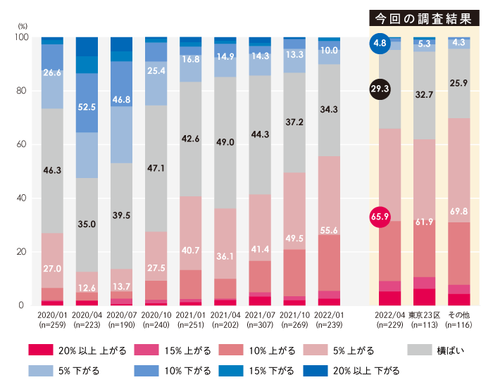☑ しかしながら、今後も上昇するという回答も60%に達しており当面価格は下がらないと予想