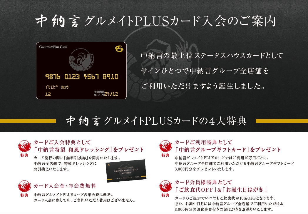 中納言およびグループ店であるイタリアン料理専門店オステリアガウダンテ、マレロッソ各店にて中納言グルメイトPLUSカードをご利用いただくと、盛りだくさんのお得なサービスが受けられます。ぜひこの機会にお申込み下さい。