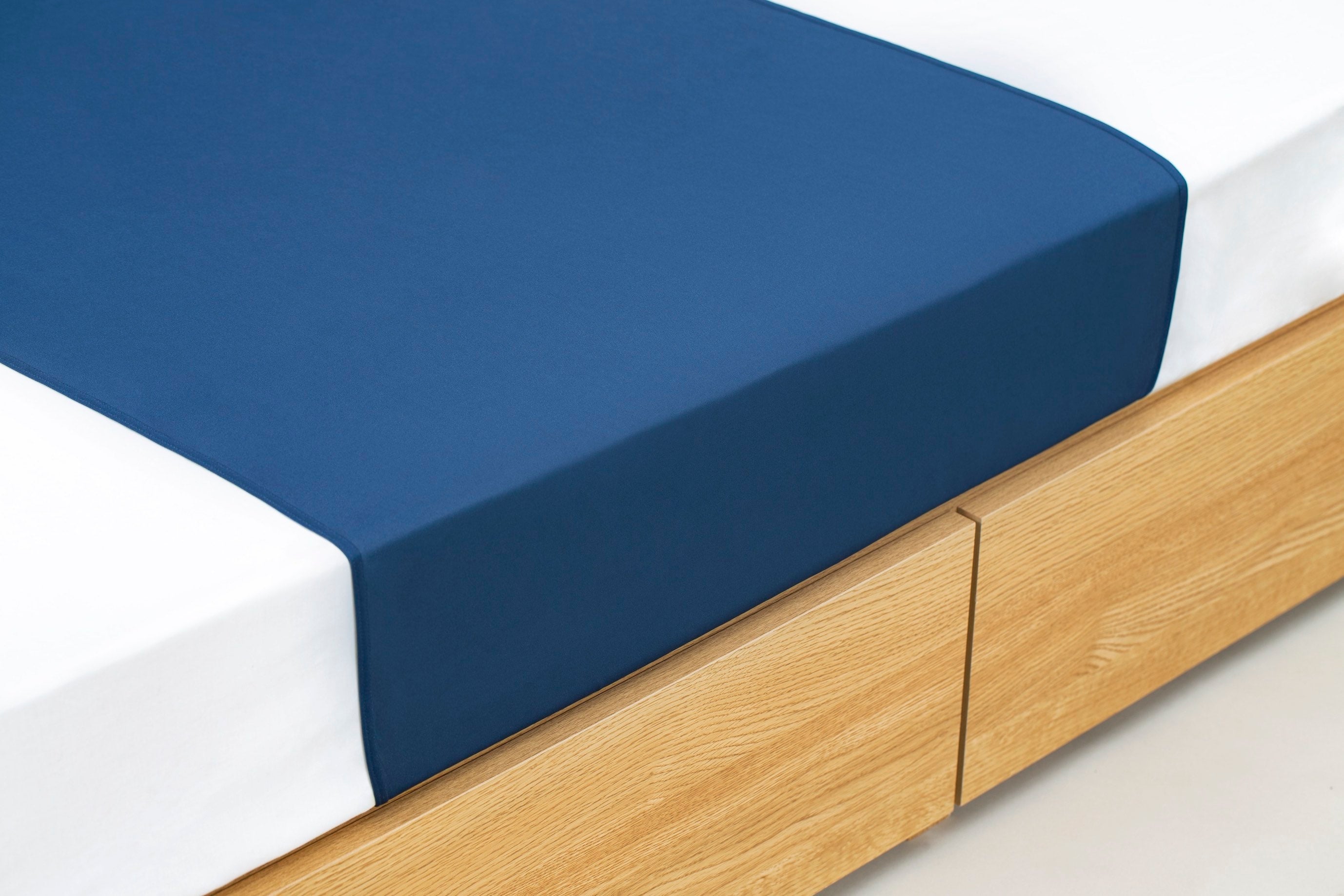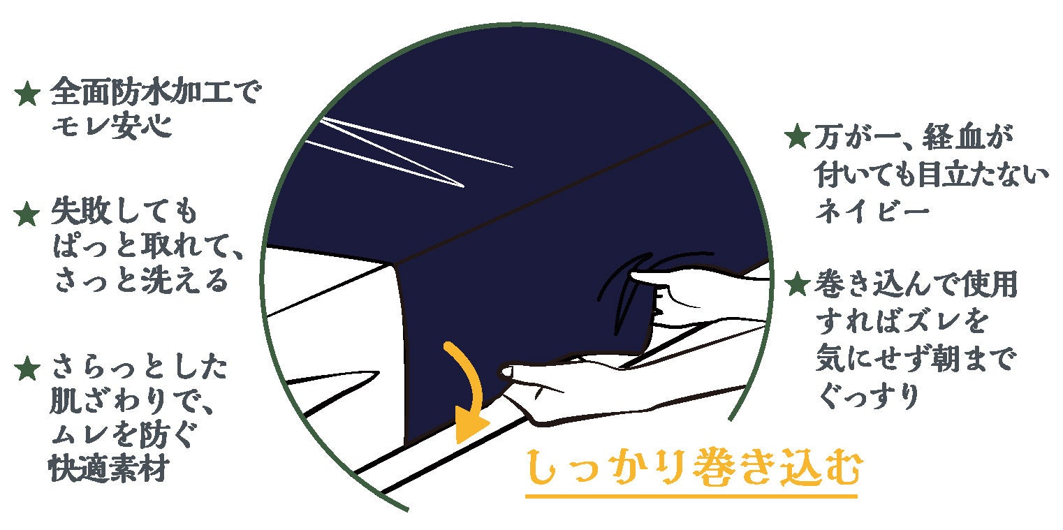 ○シーツや敷きパッドの上に敷くオーバーシーツ。ベッドや敷きふとんに巻き込んで使え、腰から膝までの広範囲に対応して経血モレから寝具を守ります。