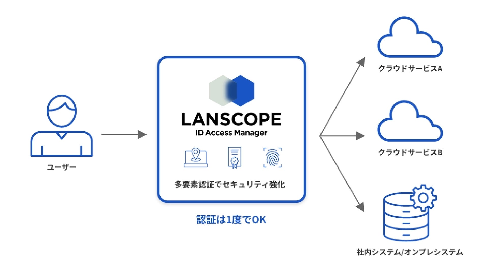 「LANSCOPE IDアクセスマネージャー」は、クラウドサービスへの安全かつスムーズなアクセスを実現するクラウド型シングルサインオン・認証基盤です。パスワードレス認証をはじめとした多要素認証、アクセス制御、アカウント管理などを一元的に提供し、利便性とセキュリティの両立を支援します。