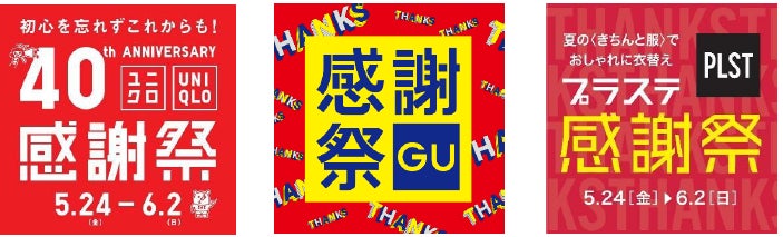 今年はジーユー、ユニクロ、プラステの3ブランドが、5月24日(金)~6月2日(日)に感謝祭を開催。3社が同時に感謝祭を開催するのは今回が初となり、各社お得なアイテムのほか、今年40周年を迎えるユニクロでは5月24日(金)~5月27日(日)の4日間、10,000円以上ご購入の方限定で40色のステンレスボトルプレゼントなど、感謝祭を楽しんでいただく企画を多数ご用意しています。
