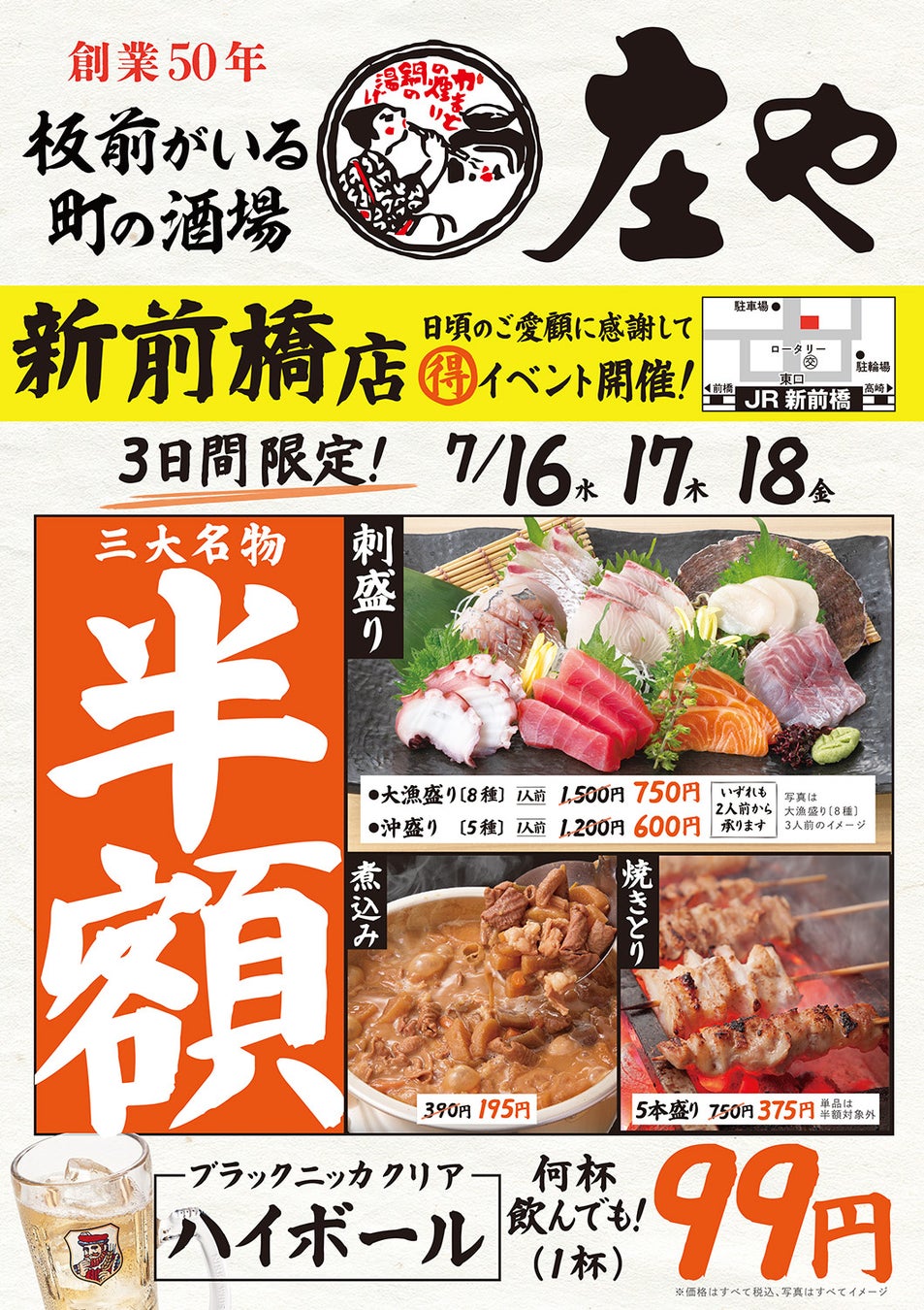 「はい!よろこんで」でお馴染みの“板前がいる町の酒場”『庄や』新前橋店(運営:株式会社大庄)は、2025年7月16日(水)より7月18日(金)までの3日間限定で、日頃のご愛顧に感謝を込め「刺身盛り合わせ」「煮込み」「焼き鳥」の三大名物を半額とする“半額感謝祭”を実施します。豊洲仲卸直送の鮮魚を使った刺身盛り合わせ「大漁盛り(8種盛)」は、通常1人前1,500円を半額の750円、同「沖盛り(5種盛)」は通常1人前1,200円を600円にて。加えて、不動の人気「煮込み」は通常390円を半額の195円。さらに、創業から受け継がれる味わい「焼きとり五本盛り」は、通常750円のところ半額の375円での超特価で提供します。