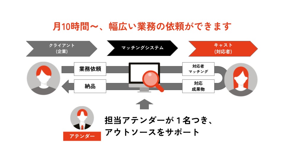 従来の「CASTER BIZ assistant」は、ディレクターとなるフロントがクライアントとキャストの間に入り、あらゆる依頼をきめ細かくサポートしていますが、STARTERプランは専用システムを介してキャストとマッチングし、直接業務の依頼をしていただくことが可能です。また、担当アテンダーが1名つき、クライアントのアウトソースをサポートします。セルフサービスの利便性とアテンダーによるサポートの安心感を両立したプランです。